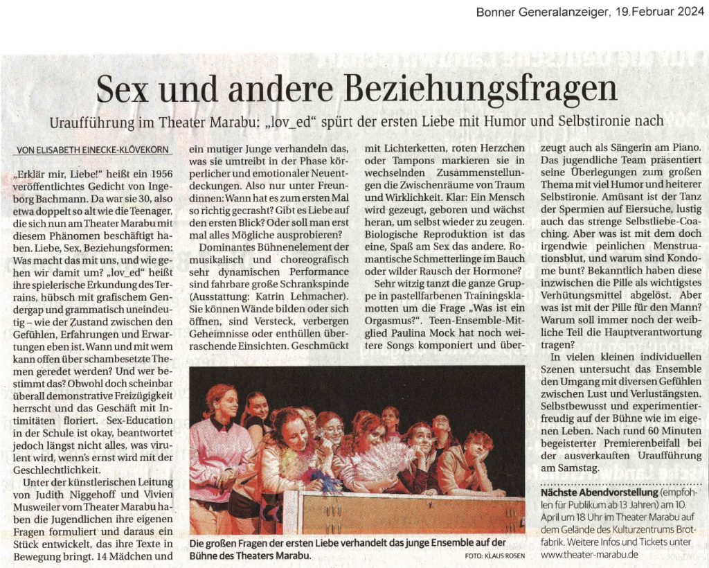 Hier eine erste Kritik zu unserer Uraufführung von „lov_ed“, einer Produktion des Teen Ensemble Marabu Bonner Generalanzeiger vom 19.02.24, Kritik lov-ed